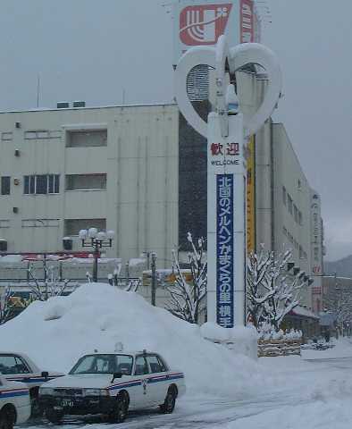 岩手県の横手市には、駅前に「北国のメルヘン かまくらの里 横手」と書いてあった。