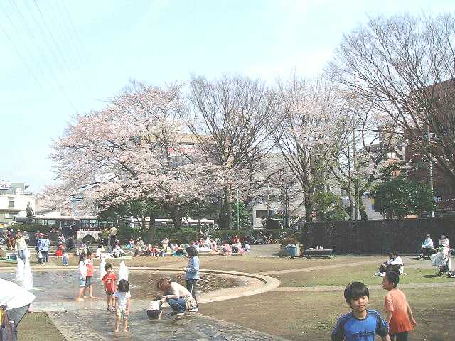 近くの公園には桜の木があり、花見をしている人が多くいた。