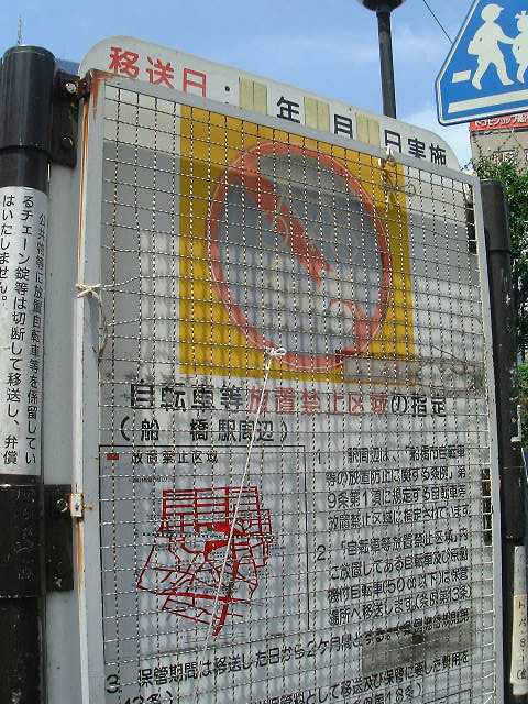 放置自転車の禁止地域であることの看板のようであるが、網がかかっているので、読みづらい。