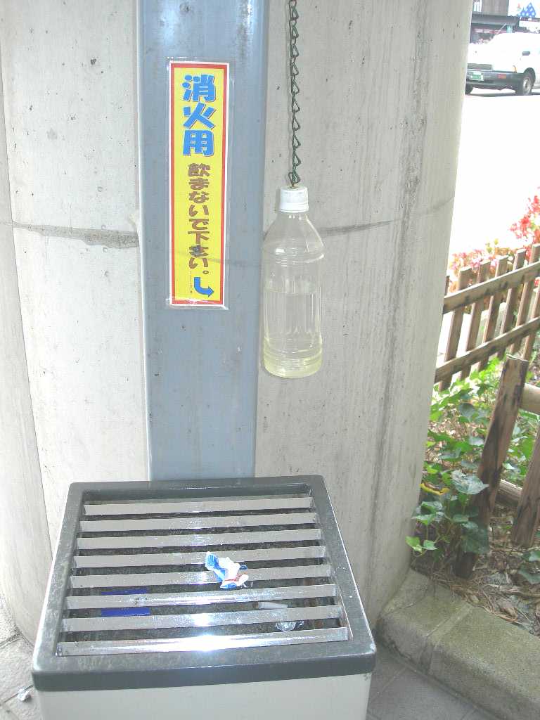 秋田県 大曲駅の喫煙所に水の入ったペットボトルが吊してあった。
