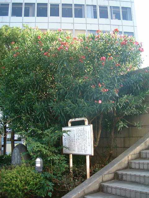 この夾竹桃は、太宰治(明治42年〜昭和23年)が、昭和10年夏から昭和11年秋にかけて、千葉県東葛飾郡船橋町五日市本宿1,928番地(船橋市宮本1丁目12番9号)に借地住まいをしていた時に、その敷地内に植えられたものですが、昭和57年12月、その敷地が整備されることになり、改めてこの地に移植された。
