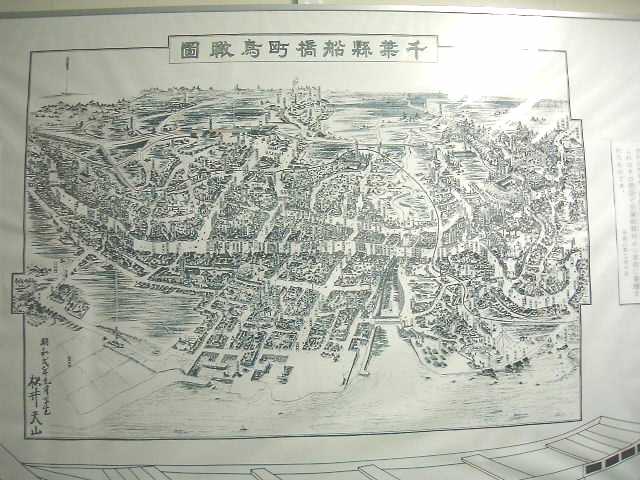船橋小学校の廊下に船橋町鳥瞰図が掲示されている。
