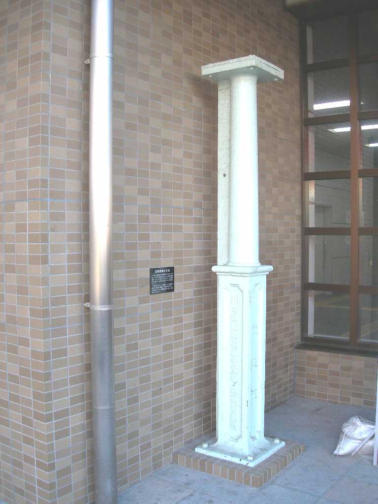 この柱は磐田駅が中泉駅と呼ばれていた当時、大正4年に跨線橋(ホームと駅舎の連絡通路)の柱として建てられたもので、日本国有鉄道終焉の年。昭和61の7月まで使用されていました。 「明治44年」「鉄道院」「川崎造船所製造」の刻印があります。 大変貴重なもので、旧跨線橋が取り壊される際に保存されました。 |