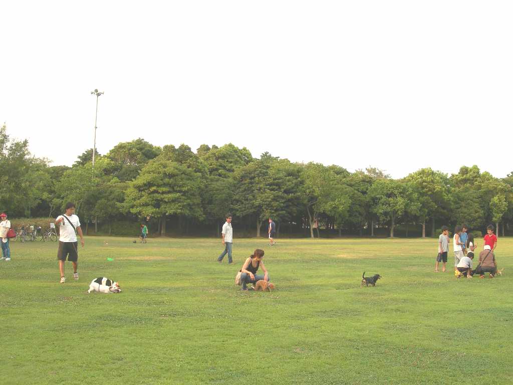 東側にある広場では、多くの人が犬を遊ばせていた。 |