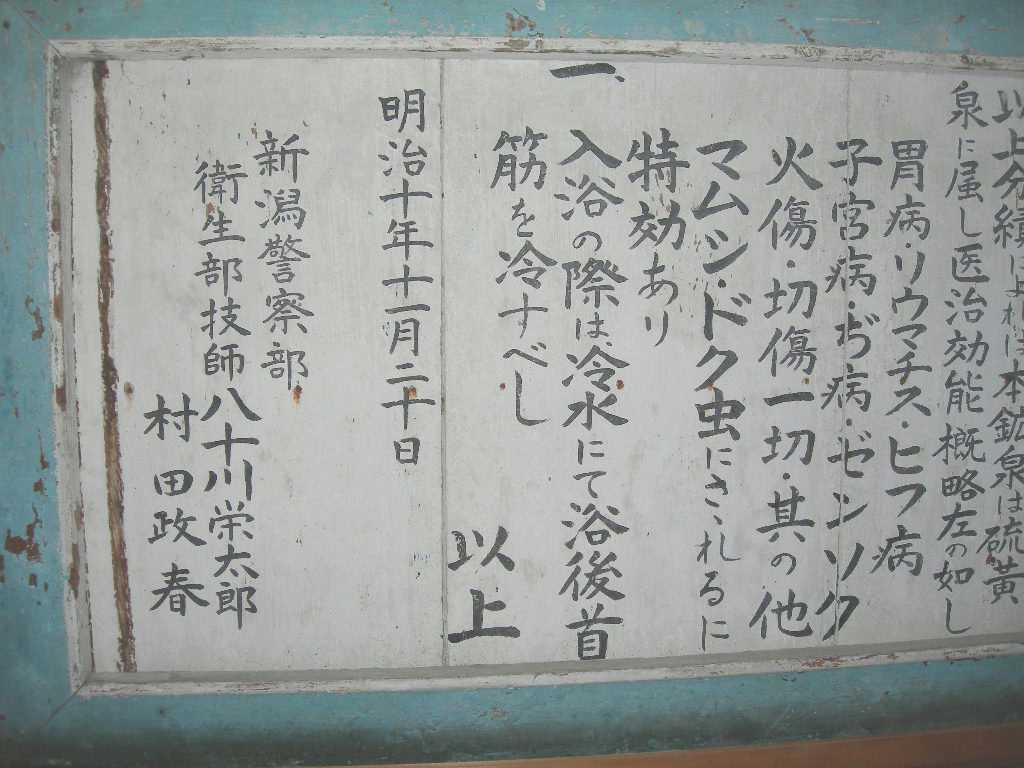 以上分績によれば本鉱泉は硫黄泉に属し 医治効能概略左の如し 胃病・リウマチス・ヒフ病 子宮病・ぢ病・ゼンソク 火傷・切傷一切 ・其の他 マムシ・ドク虫にさされるに特効あり 入浴の際は冷水にて浴後首筋を冷すべし 以上
