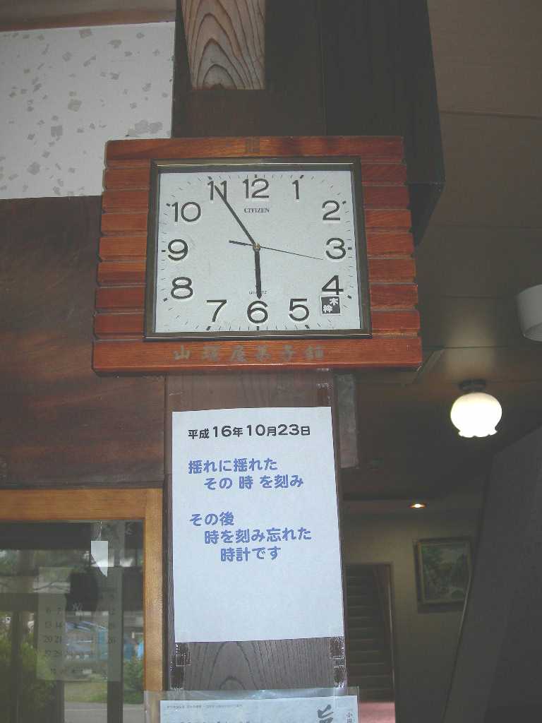 平成16年10月23日 揺れに揺れた その時を刻み その後 時を刻み忘れた 時計です |