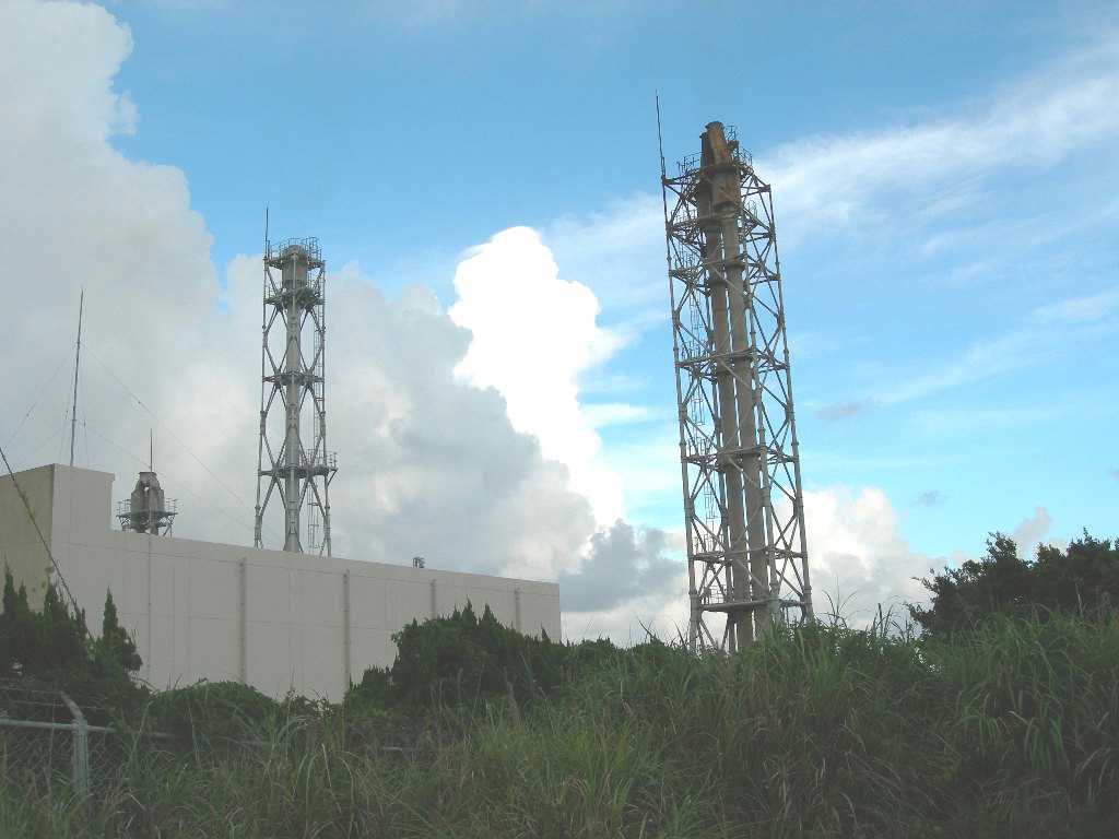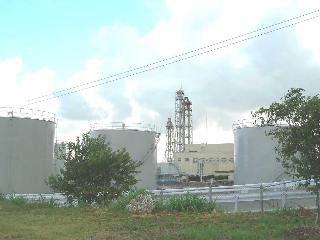 変わった形の煙突が見えて気になった。 これは発電所の煙突であると聞いた。 沖永良部島では、エンジンで発電機を回して電力を供給しているとのこと。 発電所には重油のタンクがあり、重油が燃料になっているようだ。 ここも九州電力の発電所であり、鹿児島辺りから重油を運んできて発電しているとのことで、他の地域より発電コストは10倍位かかっているらしい。 |