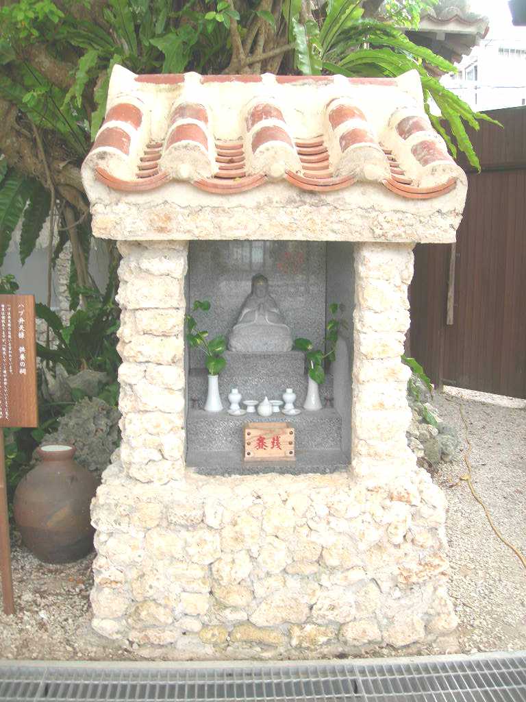 ハブは弁天様のお使いと言われています。 由来は諸説ありますが、「脱皮していく様が出世していくように見え、財産を呼び込むとして、弁財天のお使いにふさわしい」という説が有力のようです。そのため’蛇の皮を財布に入れておくと財運がつく、と言われています。 この祠は1974〜2000年まで行われていた、ハブとマングースの決闘ショーで死亡した多くのハブを供養するために作られました。 死んだハブの牙を後ろのガジュマルの木の根本に埋め、安らかに成仏するよう願う祠です。ガジュマルの無数の毛根は、まるでハブの生命が宿っているかのように広がり、日々成長しています。 |