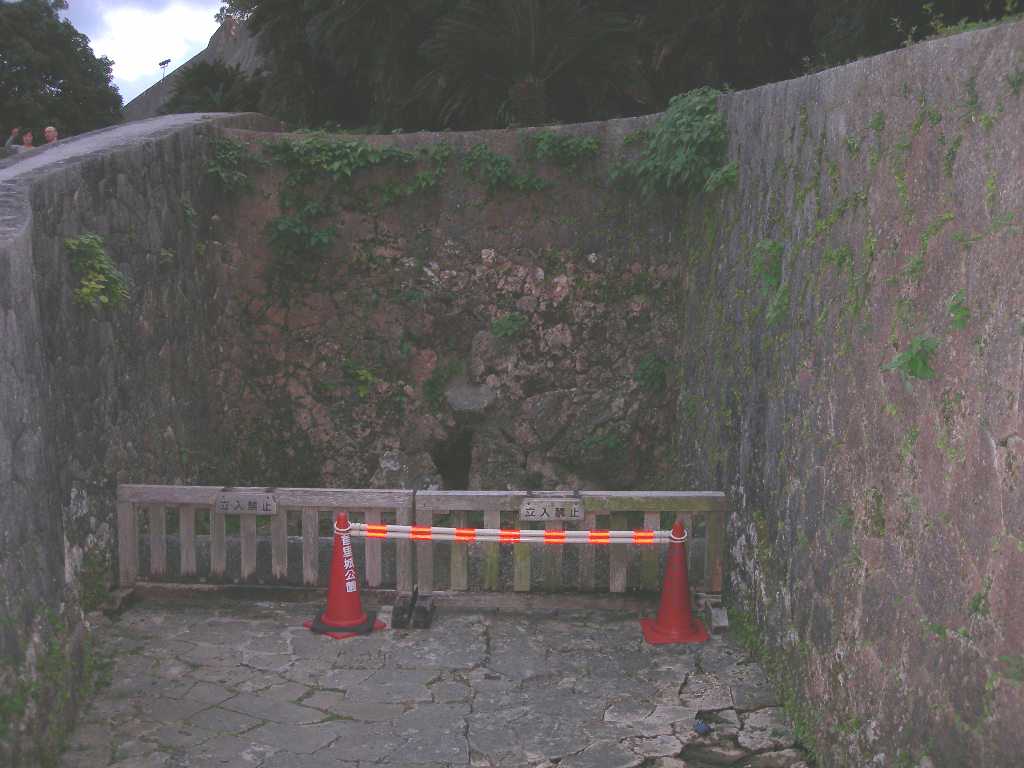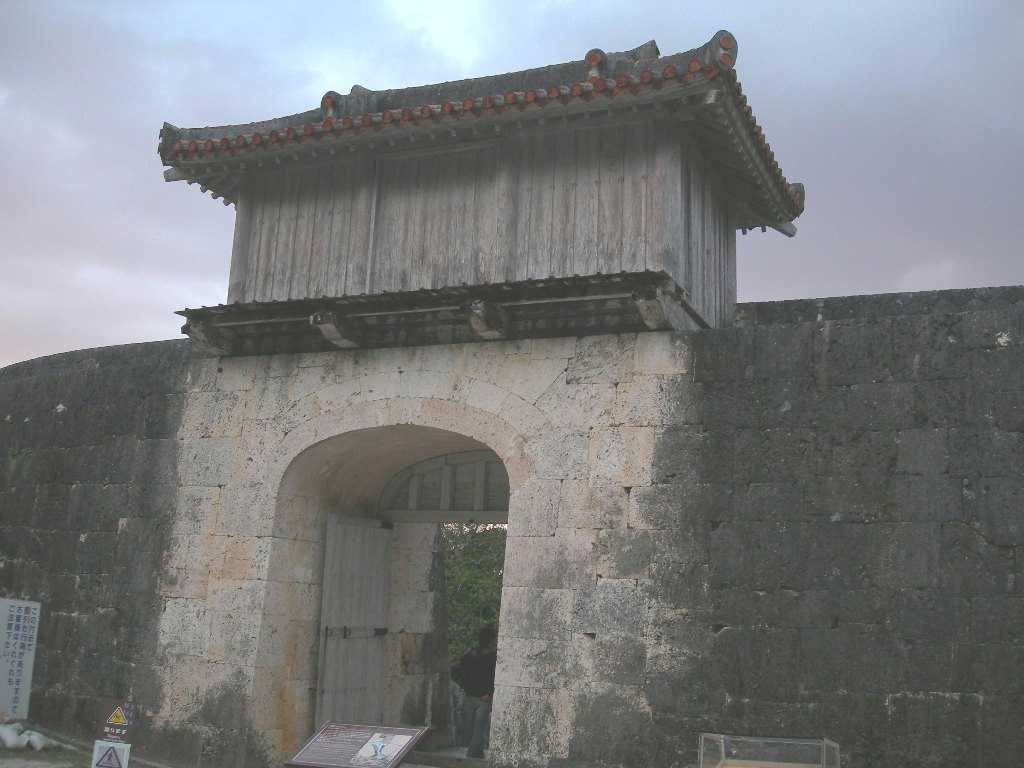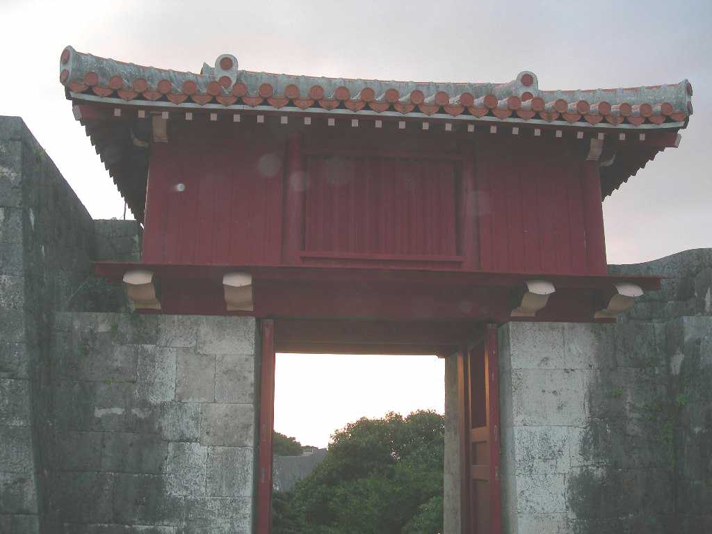 別名「ほこり御門」ともいいます。「ほこり」は歓会門の別名「あまへ(よろこび)」と対となっていて、「よろこびほこる」の意味になります。 歓会門が正門であったのに対し、ここは通用門でおもに女性が利用したといわれています。また国王が寺院にお参りするときや北の地方に行幸するときなどにも使われました。 地形の関係でこの周辺は城内に降った雨が地下水として湧き出てくる場所にあたります。 沖縄戦で焼失。1983(昭和58)年に復元されました。 |