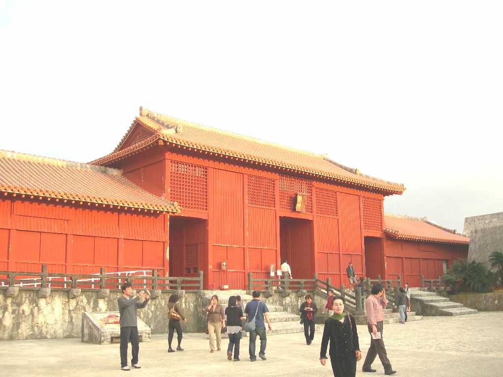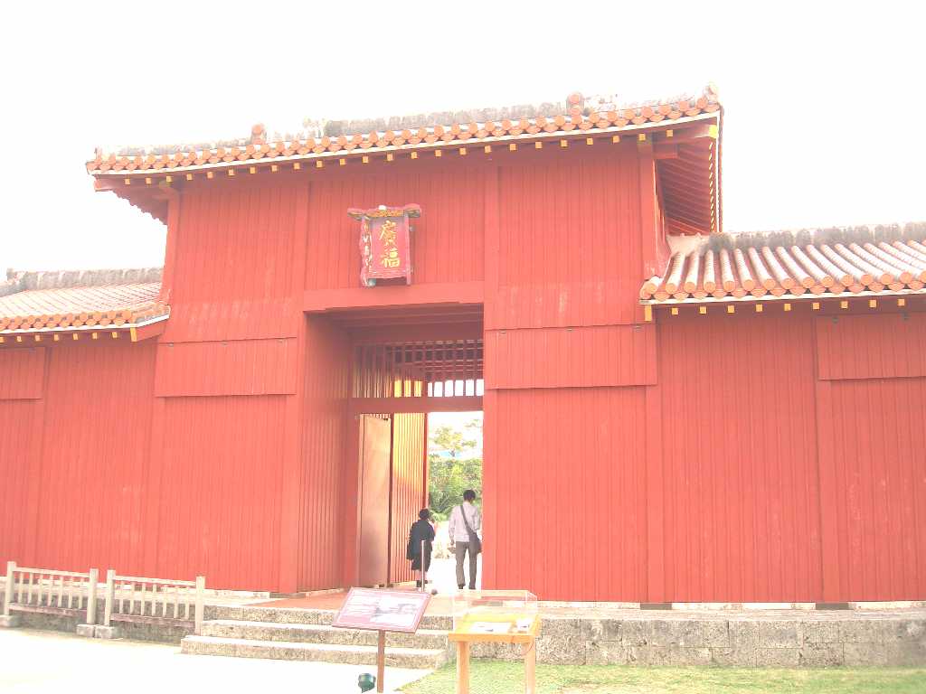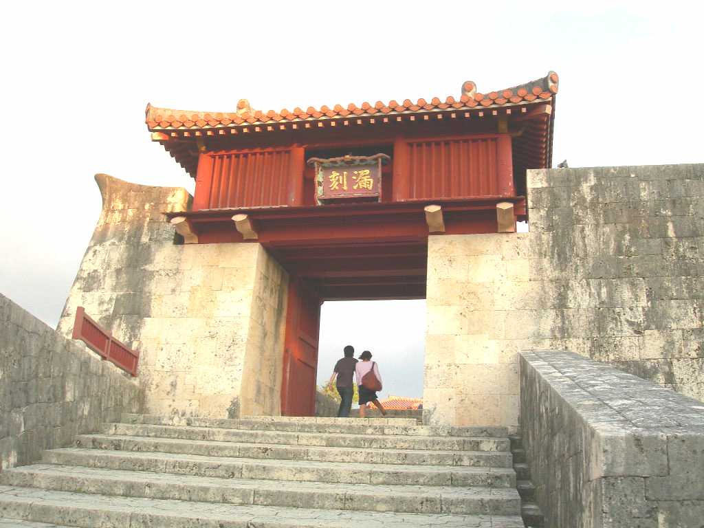 漏刻とは、中国語で水時計という意味です。この門の上の櫓の中に水で時間をはかる水槽(水時計)が設置されていました。門をすぎた広場には日時計があり、その二つで時刻をはかり、太鼓をたたいて時を知らせました。 別名「かご居せ御門」ともいいます。駕籠で登城することを許されている身分の高い役人も、国王に敬意を表しこの門で駕籠から下りたということからそのように呼ばれました。 創建は15世紀頃。老朽化のため昭和初期には撤去されていたものを1992(平成4)年に復元しました。 |