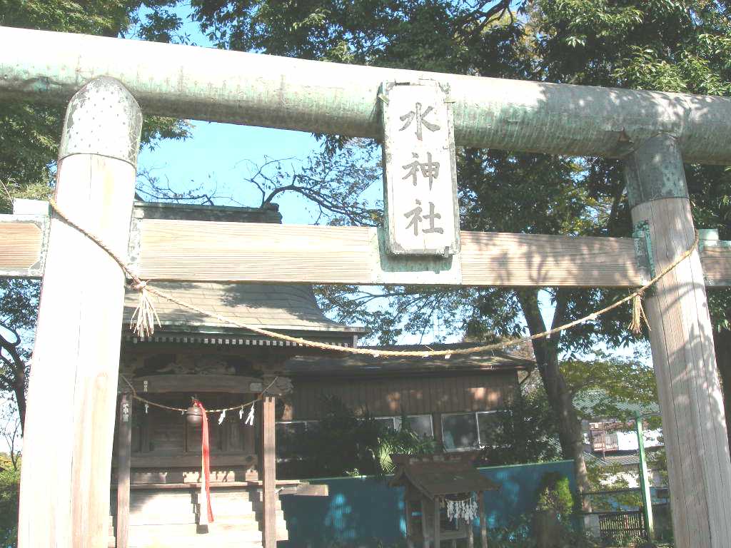 水神社は、見沼通船堀が開通した翌年の享保17年(1732)6月の創建と伝えられている。 祭神は罔象姫命である。本殿は大正12年9月1日の大震災により全壊し、同13年に再建さえたものである。 享保16年、井沢弥惣兵衛為永によって開さくされた見沼通船堀が開通し、江戸と見沼代用水縁辺の村々との物資輸送が可能になった。船は代用水路縁辺の河岸で荷物(江戸時代においては年貢米が主であった)を積んで江戸へ行き、帰りは肥料、塩、酒などの商品を積んできた。荷物の積みおろしをする河岸場は、芝川と東西縁用水路沿いに59か所あった。八丁の河岸場もその一つであり、この附近には河川輸送にたずさわる人たちが住んでいた。 水神社はそのような仕事につく人たちが水難防止を祈願して祀ったものである。 昭和58年3月 さいたま市