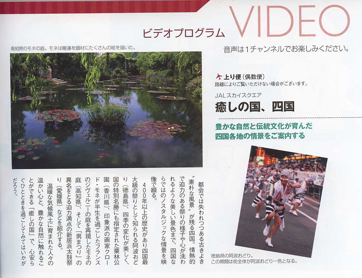 上り便の機内では、「癒しの国、四国」という四国を紹介するビデオプログラムが上映されていた。