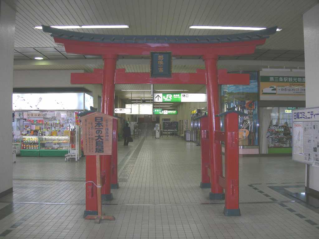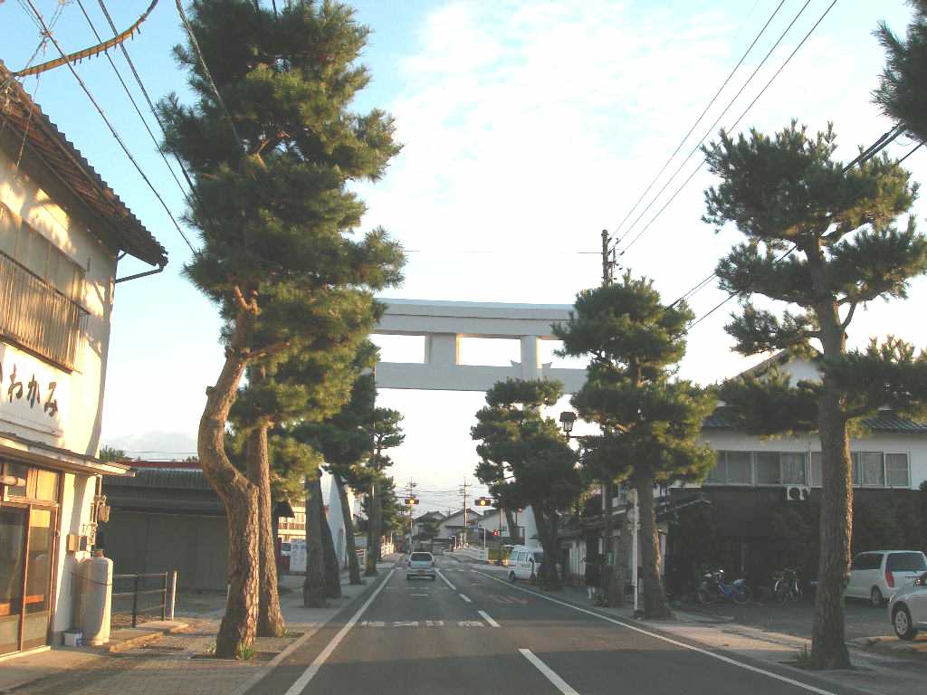 1.鳥居の高さ 23メートル 1. 柱の周囲 6メートル 1. 柱の直径 約2メートル 1. 中央の額面 6畳敷 1. この大鳥居は、大正4年御大典記念として、九州小倉の敬神家、小林徳一郎氏が両側の松とともに寄進されたものである。 |