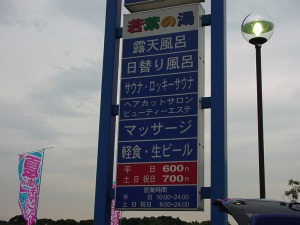 | 天然温泉 オーシャンスパ九十九里 太陽の里 | 場所:千葉県長生郡長生村一松3445 (JR外房線茂原駅より無料送迎バス) 電話:0475-32-5550 料金:大人\2000(深夜+\1000) 場所も良く、天然温泉/露天/仮眠室評判高い! H23/3、屋上に足湯ガーデン出来て10周年やってます! |