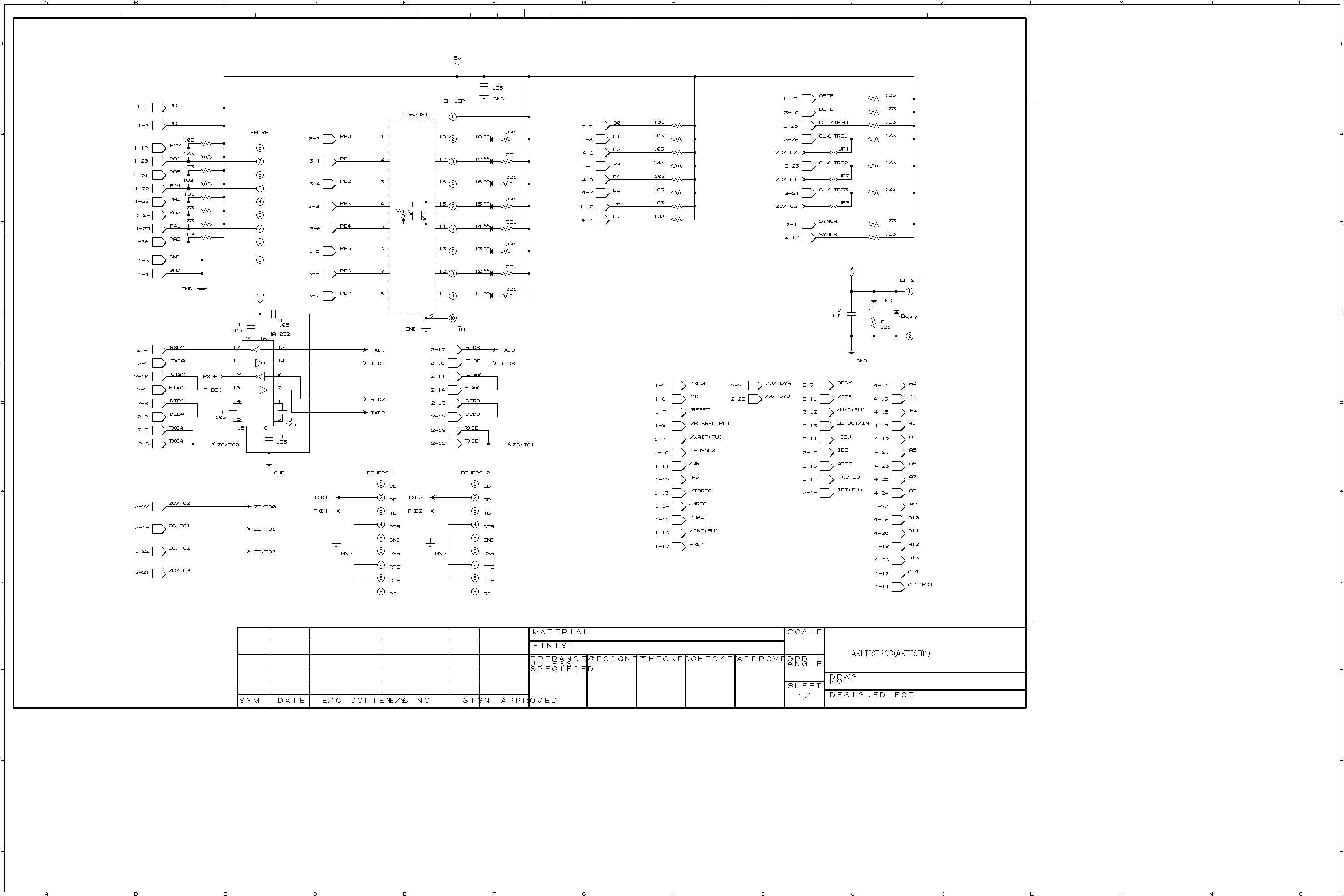 | z80のページ この度、AKI-80用インターフェースボードを開発しました 仕様: 入出力:8BIT CMOS出力(PIOポートをプルアップ) 出力:8BIT トランジスタ出力または、LED8ケ 232Cインターフェース:2CH タイマ:4CH(ジャンパで数珠つなぎ可能) 価格:¥4000(CPUボード含まず) 価格:¥8000(CPUボード含) 回路図はココ |