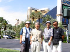 ホテルで朝食、Hotel Tropicana の駐車場でLas Vegas ホテル群をバックに記念撮影、Luxorを見ながらU-15を南下する。サボテンが生えているモハベ砂漠を走る。長い下り坂があった。この坂は自動車の実地テストに使われ、世界中のメーカーが新型車を持ち込む。小田君は経験者だ。サボテンから夏枯れの山地に変わる。Barstowの中華レストランで昼食、大変広いキャフテリア、ゆっくり食べていたが、中国系の団体バスが来て賑やかになる。ここから58号で西へMojaveと言う町で泊まる、ここの飛行場には沢山各機種が並んでいた、整備工場でもあるらしい。