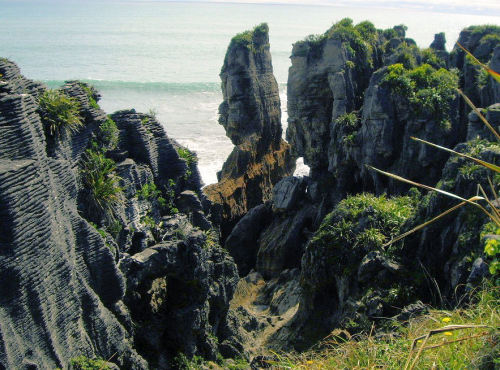 プナカイキのパンケーキロックによる。荒波に浸食された海岸線で有名な景観地で大勢の人が来ていた。歩道が整備されていて1周30分位。