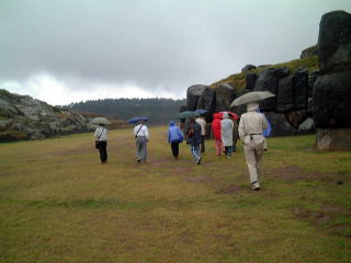 左はリャマと子供を連れてモデルをしている現地女性。雨の中懸命に稼いでいる。こちらは遊びだが向こうは生活が掛かっている。チップ1ドルは出しすぎとは思わなかった。 左は市街地にあるカテドラルで精巧な石積。 |